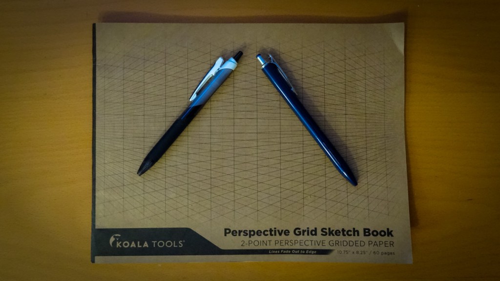 My stationary supplies arrived today! Koala Perspective Grid Sketch Book, Sarasa dry & Sarasa Grand pens. The ink in Sarasa dry is great, dries instantly. No more smears for Sinclair. Sarasa Grand is a metal pen that has a good weight that didn’t break the bank. The only matter in question was the 0.5mm cartridge. Ink is good but I prefer a 0.4mm tip. So I pulled out an ink cartridge from one of the Sarasa dry pens and installed it into the Grand. I think this is a great combo for my personal preferences. I will play arround with the Koala Perspective Grid Sketch book and see how I like it. This is my first time using this type of gridded paper. It will be fun trying this format out.